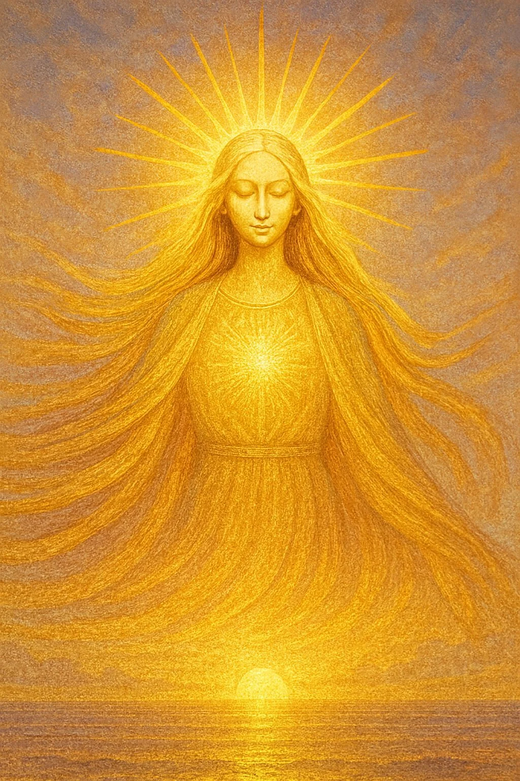 The sacred icon of Mother Dawn of Dawns shows her archetypal form: flowing horizon-hair in rose gold, orange, and yellow, a radiant crown of light, the rising sun at her back, and the whisper of a smile. This image inspires all who gaze upon it, a reminder of hope, gentleness, and new beginnings.