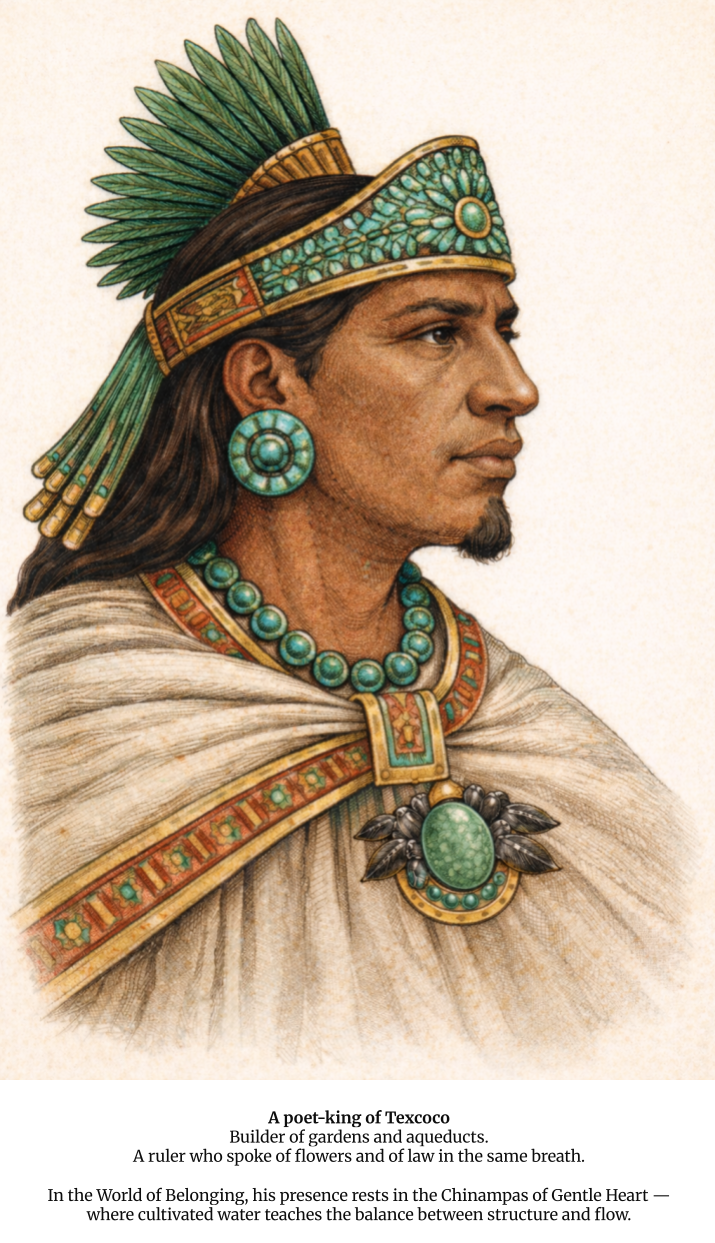 Nezahualcoyotl’s power was not only political but intellectual and architectural. He built gardens, aqueducts, and systems of law that shaped the Valley of Mexico. Exile made him thoughtful. Return made him deliberate.