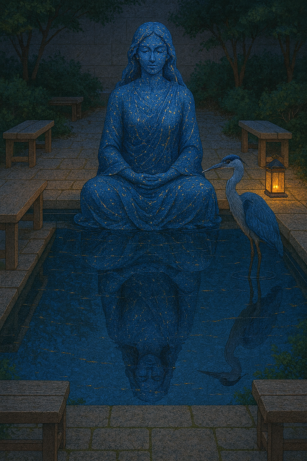 At Aletheia (ah-LAY-thee-uh)’s Pool, indigo depths shimmer with veins of gold. The pool reflects both the seeker and the shadows, offering them dignity before release. Around its edge, benches invite gathering. A heron keeps patient watch, and the lantern of the Witness assures that no one enters this work alone. Here, shadow and light are held together, and truth shines clear.
